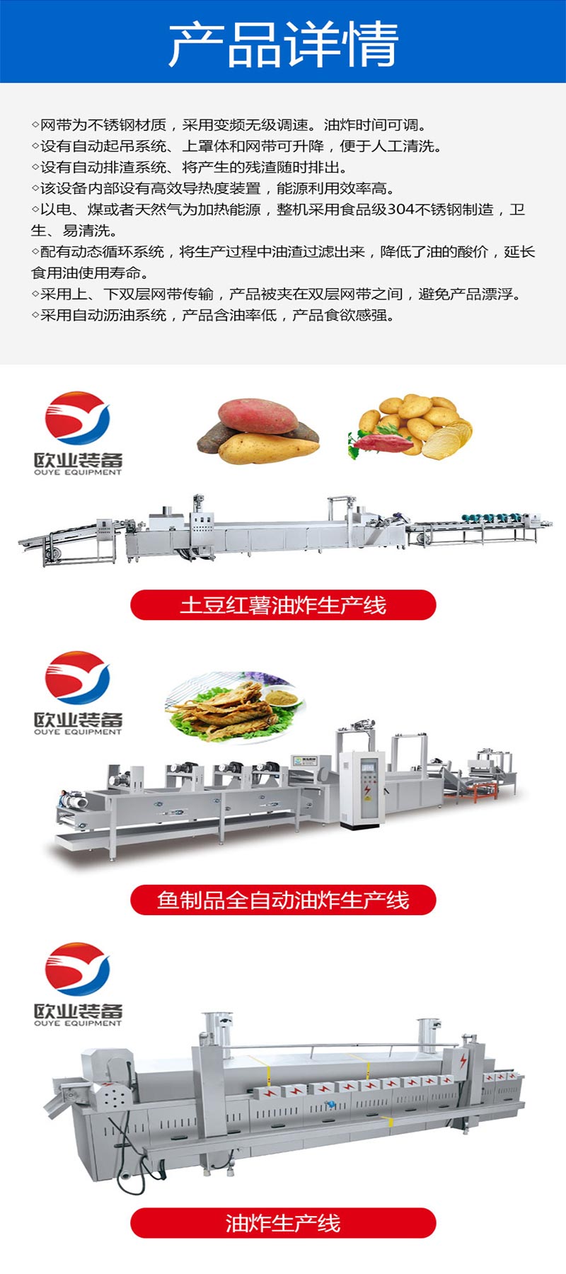 特點(diǎn):◇網(wǎng)帶為不銹鋼材質(zhì),采用變頻無級(jí)調(diào)速。油炸時(shí)間可調(diào)。◇設(shè)有自動(dòng)起吊系統(tǒng)、上罩體和網(wǎng)帶可升降,便于人工清洗。◇設(shè)有自動(dòng)排渣系統(tǒng)、將產(chǎn)生的殘?jiān)S時(shí)排出。◇該設(shè)備內(nèi)部設(shè)有高效導(dǎo)熱度裝置,能源利用效率高。◇以電、煤或者天然氣為加熱能源,整機(jī)采用食品級(jí)304不銹鋼制造,衛(wèi)生、易清洗。◇配有動(dòng)態(tài)循環(huán)系統(tǒng),將生產(chǎn)過程中油渣過濾出來,降低了油的酸價(jià),延長食用油使用壽命。◇采用上、下雙層網(wǎng)帶傳輸,產(chǎn)品被夾在雙層網(wǎng)帶之間,避免產(chǎn)品漂浮。◇采用自動(dòng)瀝油系統(tǒng),產(chǎn)品含油率低,產(chǎn)品食欲感強(qiáng)。