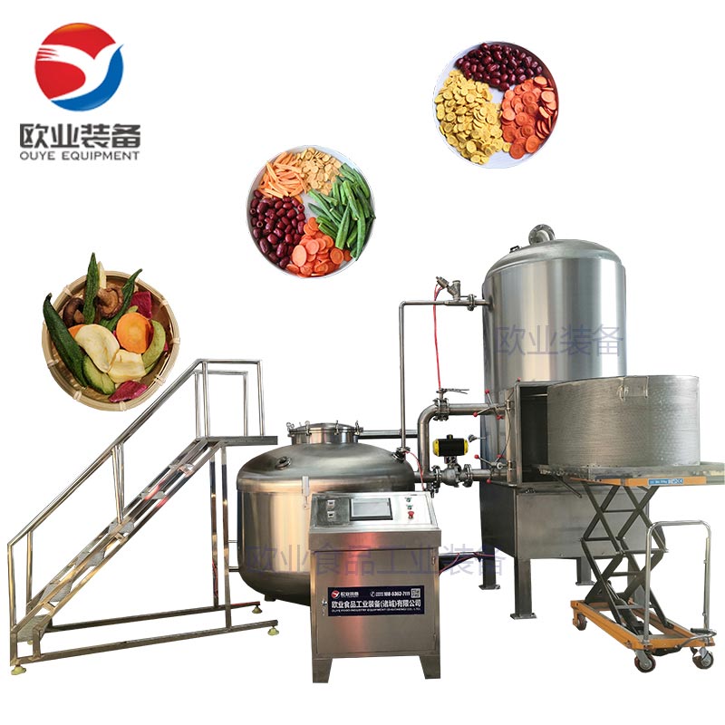 真空低溫油炸設備組成:真空油炸罐、油加熱系統、真空系統、儲油補油系統、氣動系統、自動脫油系統